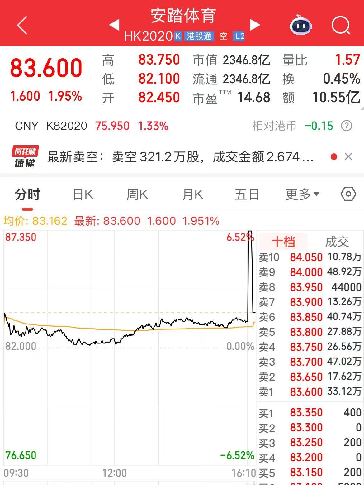 截至11月24日收盘,安踏体育上涨1.95%,报83.60港元/股,市值为2346.8亿港元。